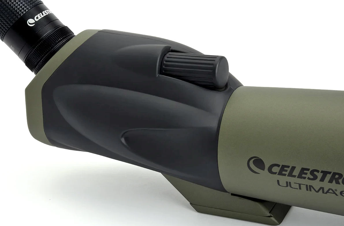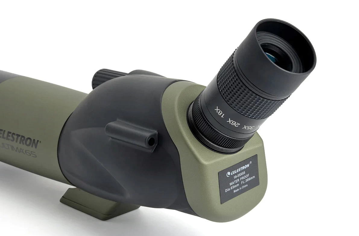 Obiectivul de 65 mm al lunetei Celestron Ultima oferă imagini de o claritate remarcabilă, în special în timpul utilizării pe timp de zi. Datorită stratului său antireflex de înaltă calitate, imaginile sunt mai bogate în culori decât cele ale concurenței. Ocularul cu zoom inclus în pachetul de bază permite ajustări rapide între măriri de 18x și 55x - doar rotiți partea laterală și, cu o singură mișcare, puteți aduce "mai aproape" detalii precum penajul colorat al unei păsări sau coarnele unui cerb.