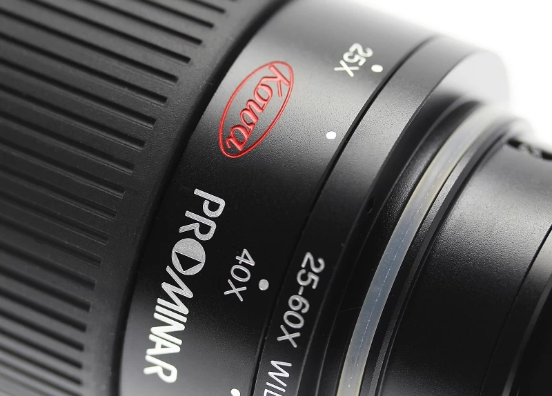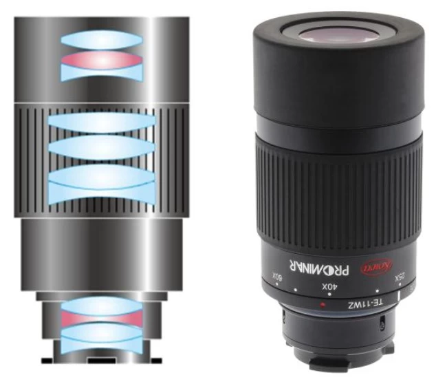 Kowa TE-11WZ se mândrește cu un unghi de vizualizare uriaș (1.32 - 2.4°), iar sistemul de lentile cu 2 elemente XD cu dispersie scăzută reduce aproape la zero aberația cromatică. Distanța pupilară este de 17 mm.