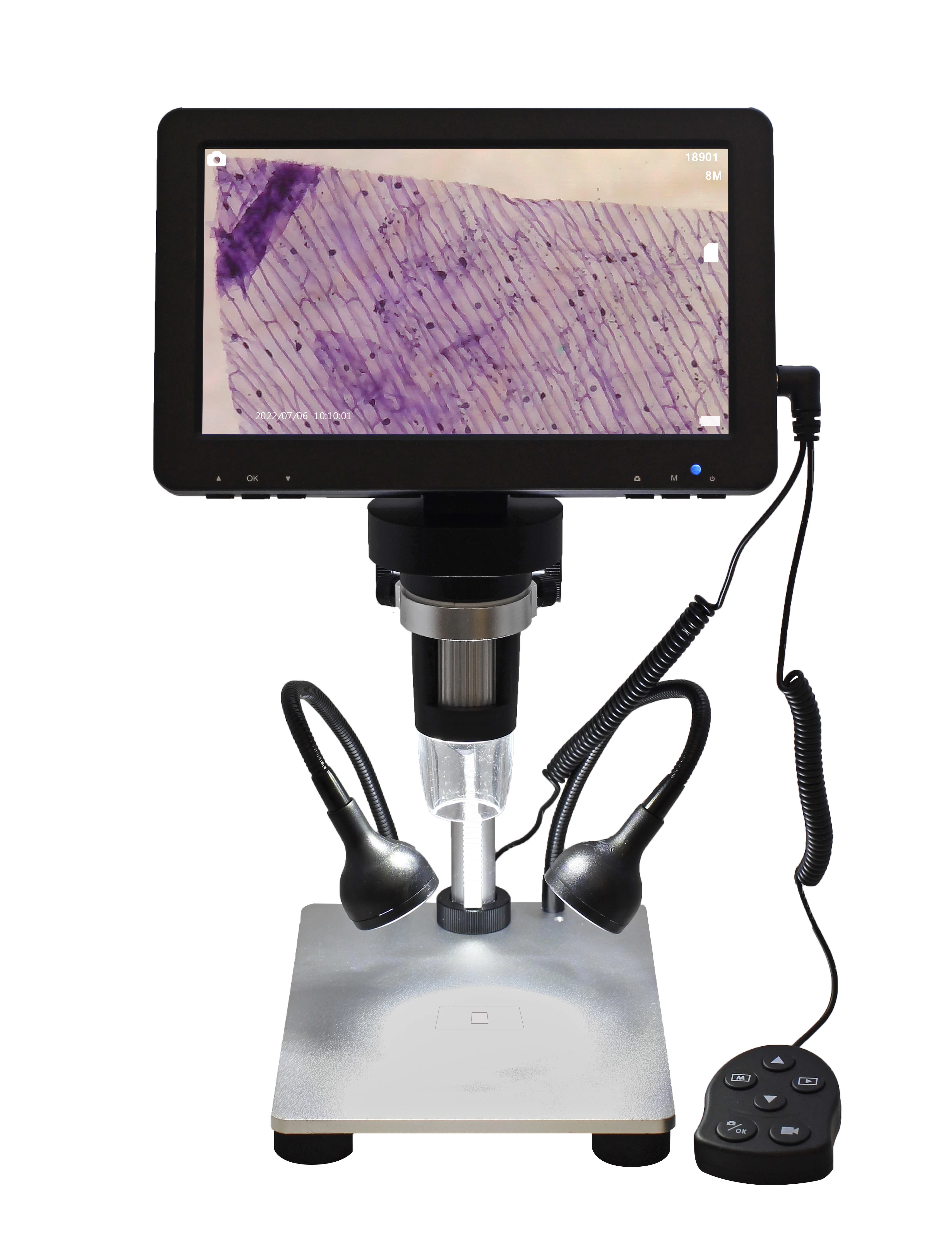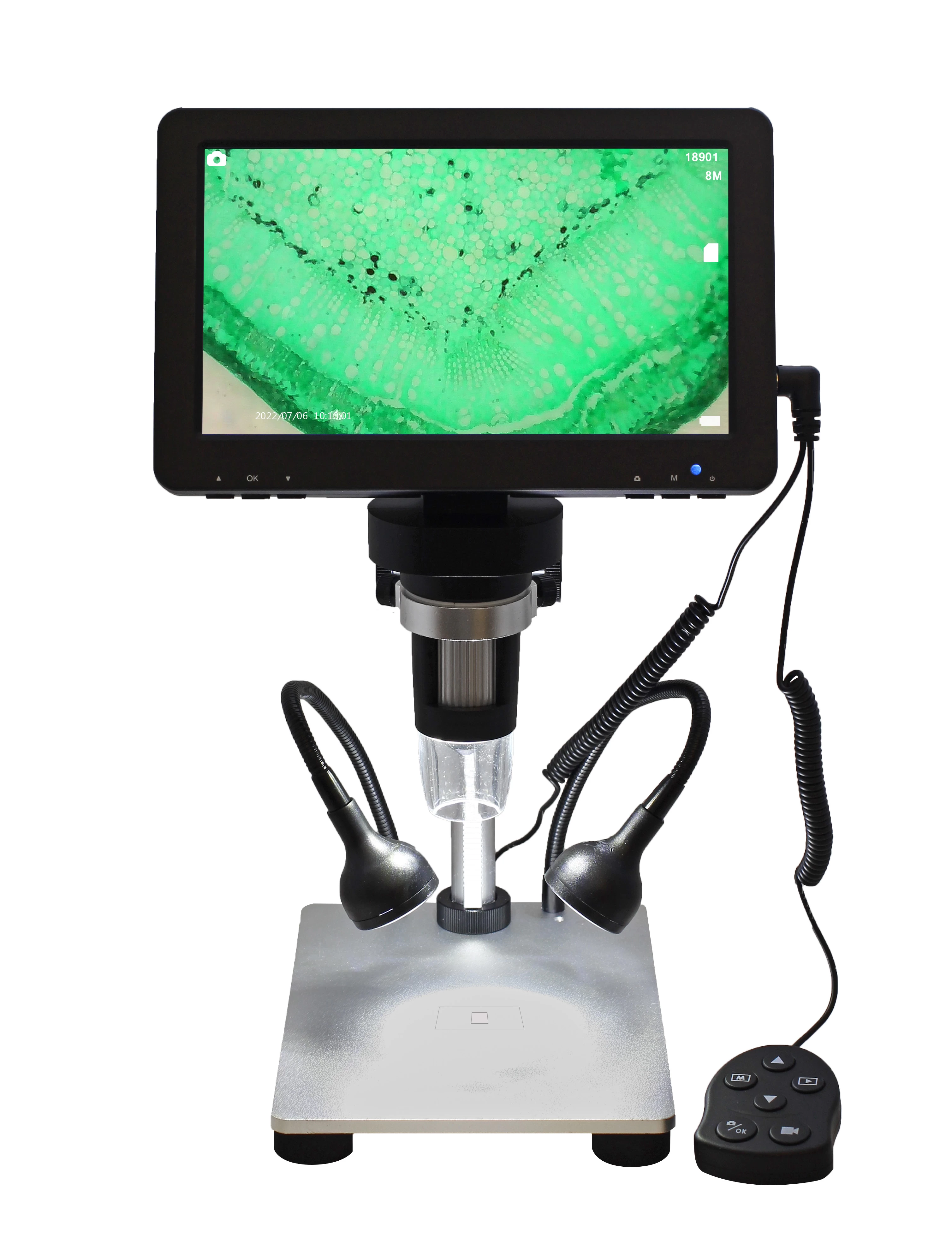 Deși baza metalică solidă și mecanismul de mișcare metalic susțin bine microscopul digital integrat cu ecranul, la măriri mai mari ne vom bucura cu adevărat că acest microscop vine cu un declanșator la distanță! Cu declanșatorul la distanță nu doar că putem iniția fotografii și videoclipuri, dar putem naviga cu ușurință și în meniul logic structurat. Capul microscopului este la o distanță de 70 mm de masă în poziția cea mai înaltă.