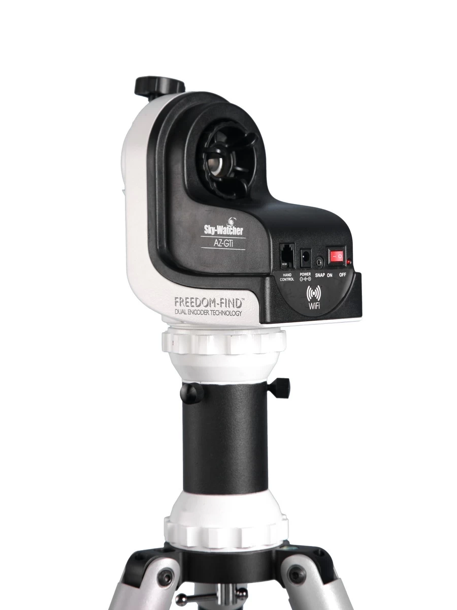 Noul mecanism azimutal AZGTi de la SkyWatcher este motorizat și controlat prin GoTo, putând fi operat prin smartphone sau tabletă prin conexiune wi-fi. Opțional, poate fi utilizat și cu un controler manual SynScan. Datorită encoderelor integrate, poate fi mișcat manual fără a pierde poziția, permițând trecerea între căutarea automată și cea manuală în orice moment.