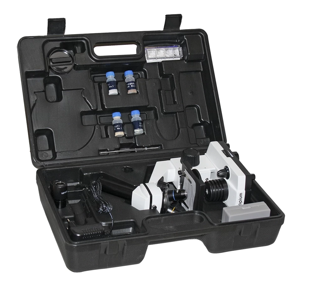 Pachetul nostru include, pe lângă microscop, o serie de accesorii mici, dar utile: un set pentru prepararea probelor (de exemplu, microtom, bisturiu), 5 lame de microscop goale, 5 preparate pre-făcute (frunză de pin, bumbac, picior de muscă, frunză de ceapă, rădăcină de fasole). Toate acestea sunt livrate într-o valiză de plastic practică. Microscopul va captiva cu siguranță copiii interesați de microscopie pentru mult timp!