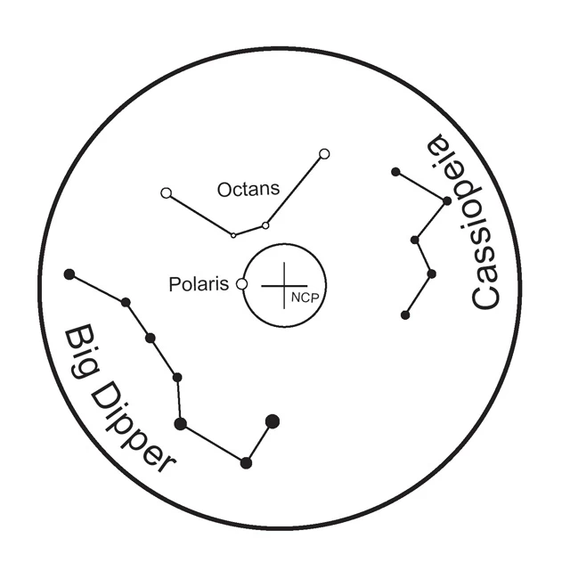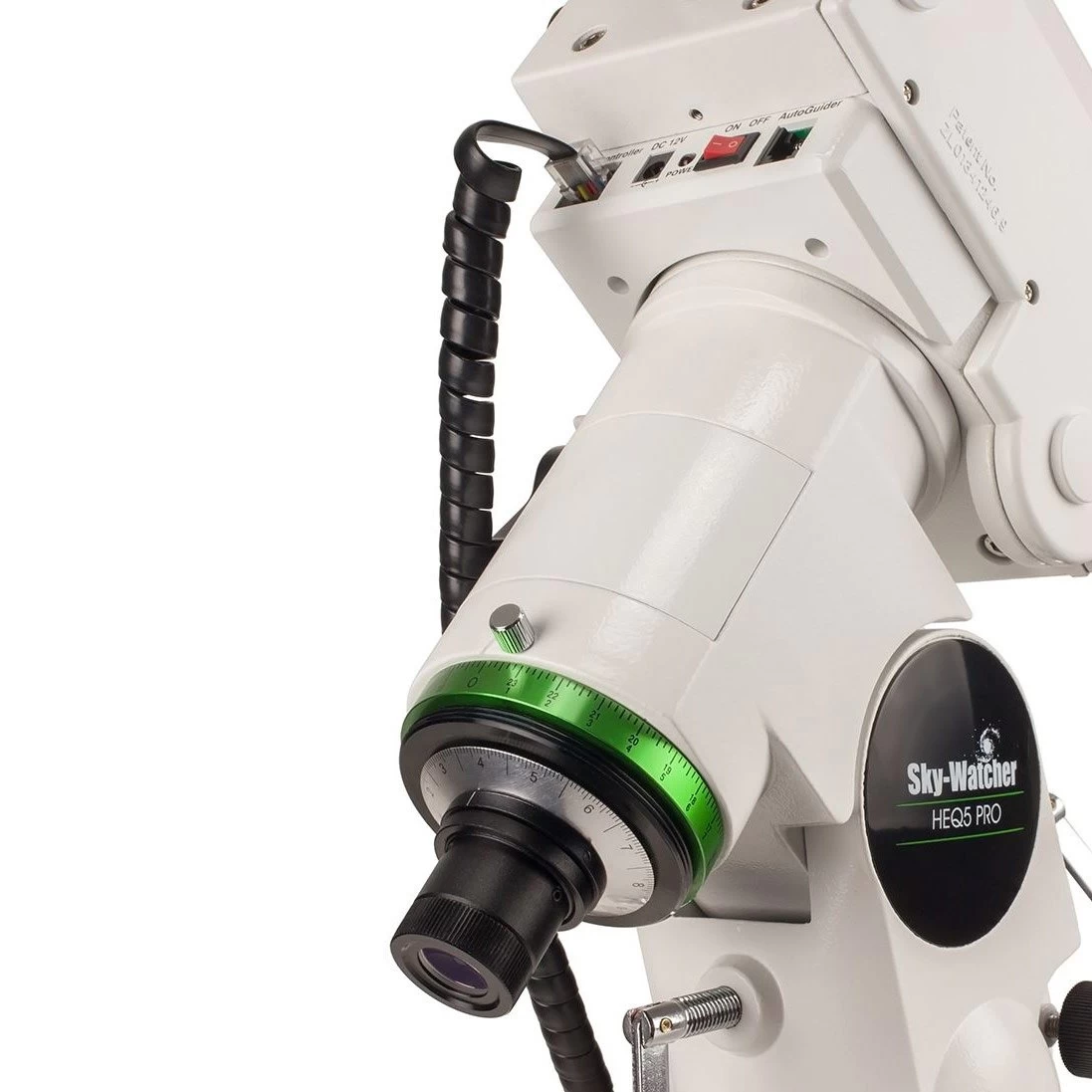 Reticulul lunetei polare a mecanicii SkyWatcher HEQ-5 Pro poate fi iluminat, facilitând alinierea precisă la pol. Pachetul de bază include un cablu cu adaptor pentru brichetă, permițând funcționarea mecanicii de la bricheta auto. Pentru ieșiri, se recomandă o soluție cu acumulator, dar funcționarea de la rețeaua de 220V este posibilă cu un adaptor de rețea opțional de 2A sau 5A.