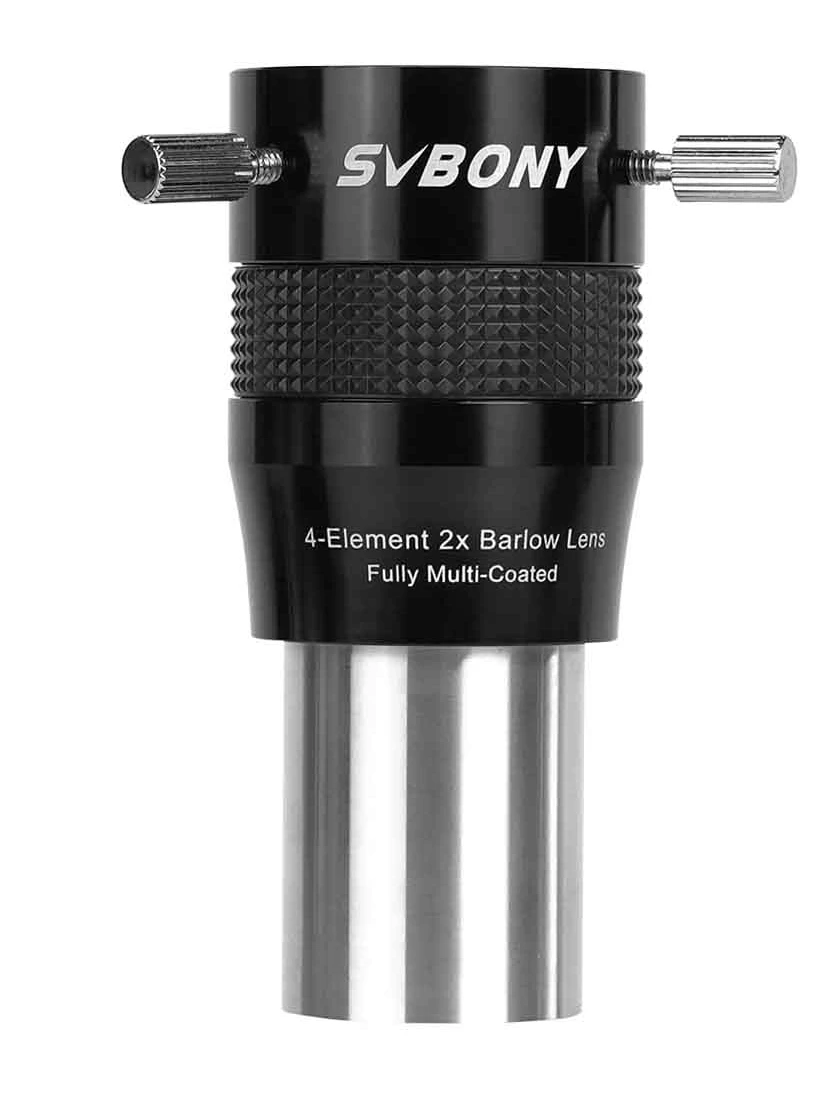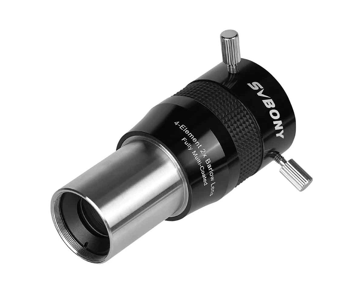 Svbony SV216 2x lentilă Barlow dispune de un sistem optic apocromatic de înaltă calitate cu 4 elemente de lentilă, ideal atât pentru utilizare vizuală, cât și pentru astrofotografie. Straturile antireflex FMC asigură minimizarea reflexiilor și maximizarea transmisiei luminii. Filetul de la baza lentilei Barlow permite atașarea filtrelor de 1.25".