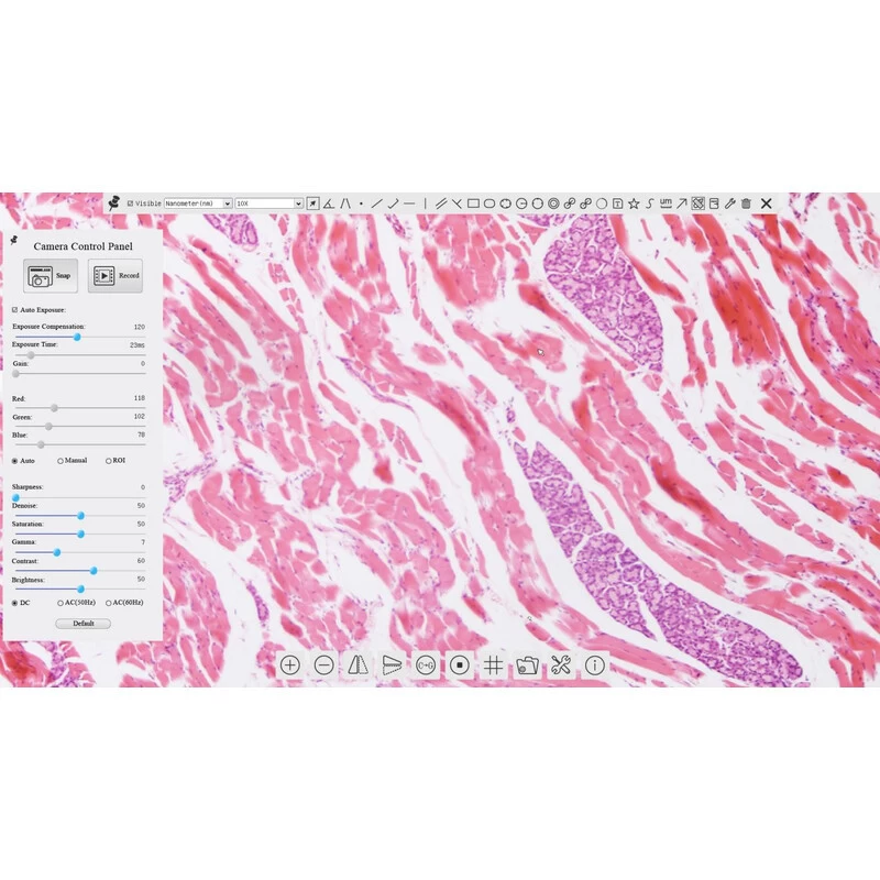 Datorită ieșirii HDMI, imaginea poate fi proiectată pe un televizor sau proiector fără a folosi un computer, facilitând astfel partajarea imaginii văzute la microscop în educație, medicină sau utilizare industrială. Sistemul de operare încorporat permite o utilizare versatilă: imaginea camerei poate fi salvată pe stick-ul USB inclus fie în format static, fie video. Mai mult, sunt posibile diverse operațiuni de măsurare a unghiurilor și distanțelor, iar software-ul poate fi calibrat pentru a calcula dimensiunile obiectelor în milimetri. Camera este ușor de utilizat, fiind controlată cu ajutorul unui mouse USB inclus.