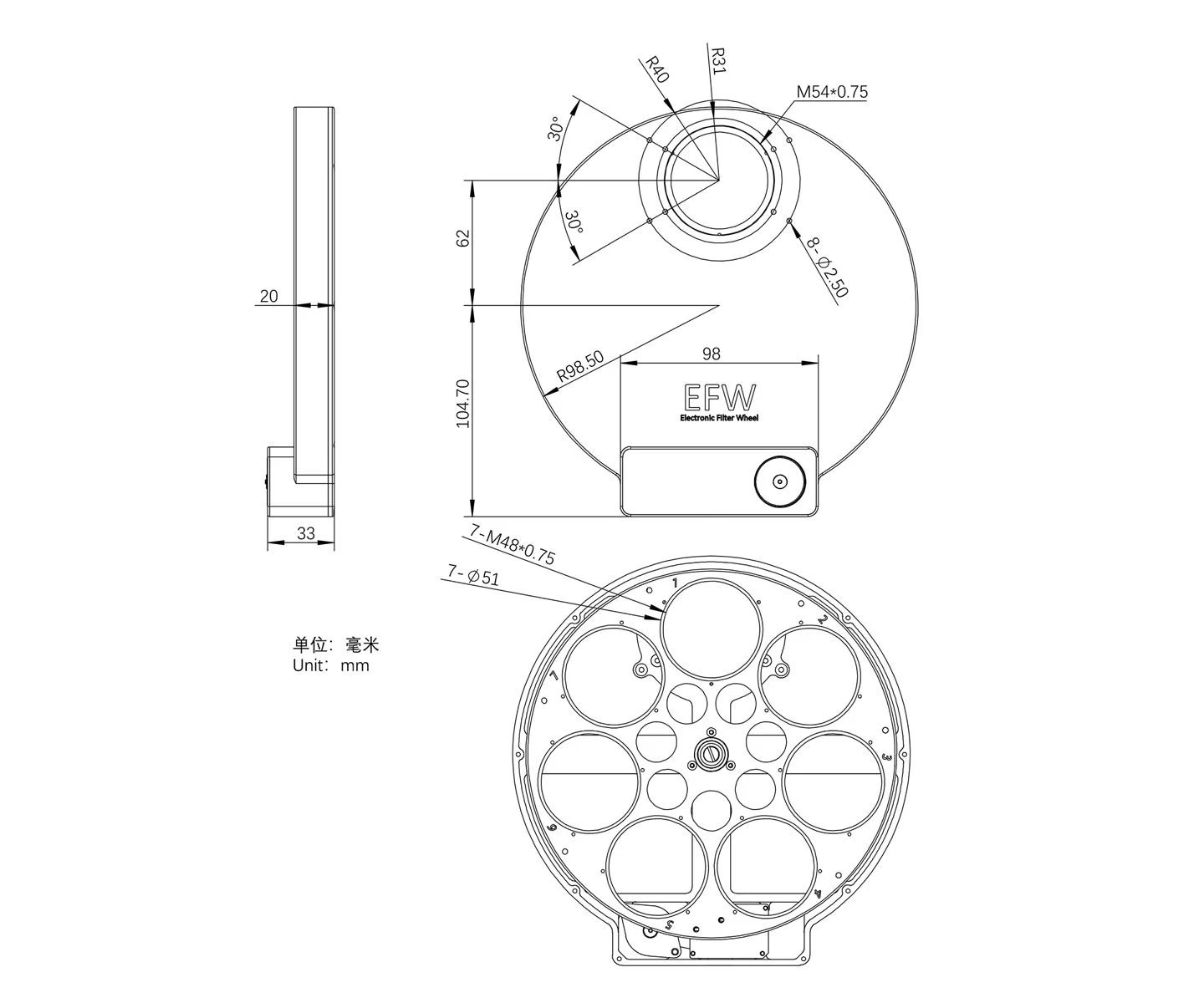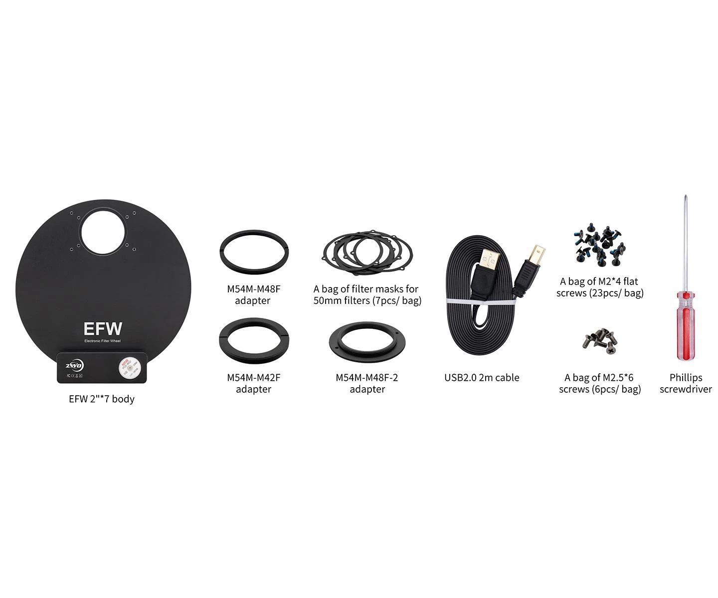 Roata de filtre are filet M54 (model 7×2") pe ambele părți pentru montarea la telescop și cameră. Se conectează la calculator prin portul USB 2.0, iar după instalarea driverului ASCOM, poate fi controlată cu orice software compatibil. Alimentarea roții de filtre se face tot prin portul USB 2.0, astfel că nu sunt necesare mai multe cabluri, fiind suficient un singur cablu USB. Consumul maxim de curent al roții de filtre ZWO motorizate este de aproximativ 120 mA @ 5V, ceea ce permite funcționarea de la portul USB2.0 al unei camere CCD cu răcire. În pachet se găsesc inele adaptor M54/M48 și M54/T2 pentru montarea diferitelor dispozitive.